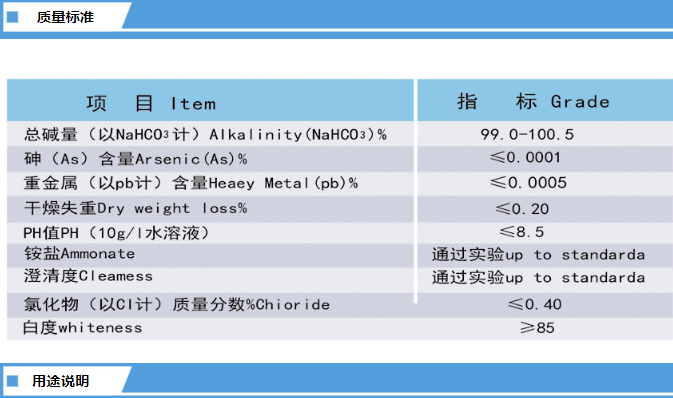 化學(xué)名稱:碳酸氫鈉 NaHCO3 產(chǎn)品用途:碳酸氫鈉俗稱小蘇打,產(chǎn)品呈白細(xì)小晶體,無(wú)臭、咸味。 物化性質(zhì):主要用于食品工業(yè)中做添加劑、橡膠工業(yè)中做發(fā)泡劑、醫(yī)藥工業(yè)中做制酸劑、消防器材發(fā)生劑、洗滌劑的配合剤、印染、紡織、滅火劑、研磨劑、化工助劑、電影制片的洗滌劑以及汽水、啤酒、飲料中的二氧化碳發(fā)生劑等。 |